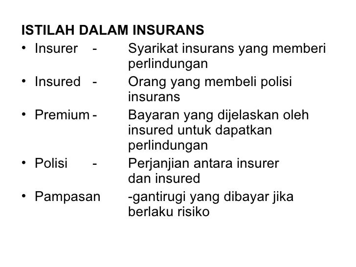 Insurans Kemalangan Peribadi memberi perlindungan kepada sesorang individu terhadap kerugian yang berpunca daripada kemalangan seperti kemalangan dalam perjalanan dan beberapa jenis permainan pembunuhan kejadian rusuhan keracunan dan serangan Kadar premium dikenakan mengikut a. Dengan memajami istilah-istilah dalam perasuransian nasabah diharapkan dapat menjadi lebih memahami apa saja manfaat perlindungan sesuai produk asuransi yang paling cocok dengan kebutuhannya. Padahal memahaminya sangat penting bagi pemilik polis asuransi.